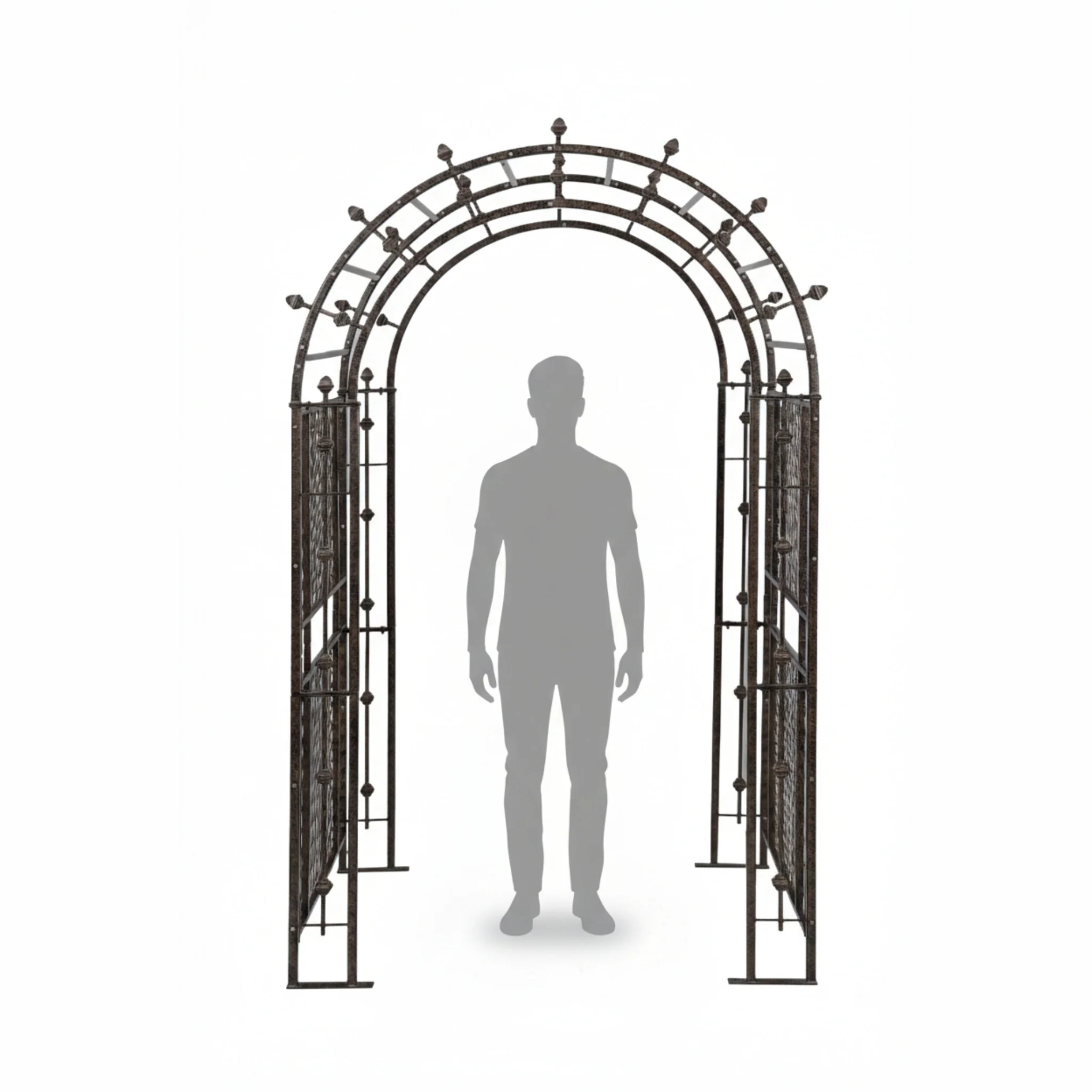 Finished in a charcoal brown powder coat with hand-applied black faux detailing, this garden arch iron structure blends into landscaping while maintaining a refined architectural presence. The gridwork supports plant attachment while keeping airflow and visibility through the arch.