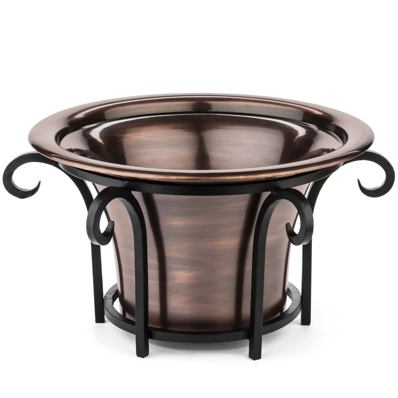 - Metal planter pot with antique copper finish includes a half-inch solid iron frame with flat black powder-coated finish and heavy-duty black chain with S hooks. The top of the chains are joined by a ring as shown in the photo. Drainage hole in the base of metal copper hanging planter pot. The design of this outdoor planter is modern with a timeless feel. Place outdoors on your patio, deck, or balcony. Sold as a single, but also great in pairs or multiples. -