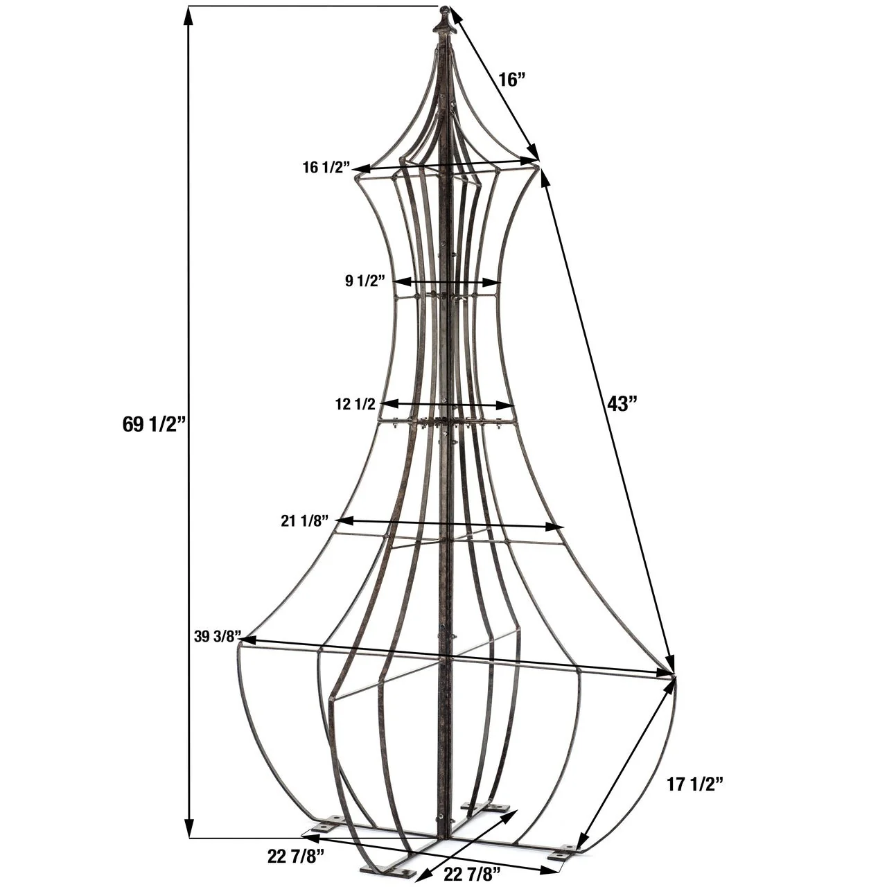– Professionally packaged and requiring assembly, the iron Genie trellis is pleasing to the eye and perfect for growing vines. With dimensions of 39.5 inches wide by 69.5 inches high (plus 8 of the 12 inch ground spikes), this heavy-duty trellis offers a secure anchoring system that will happily support large plant material. -