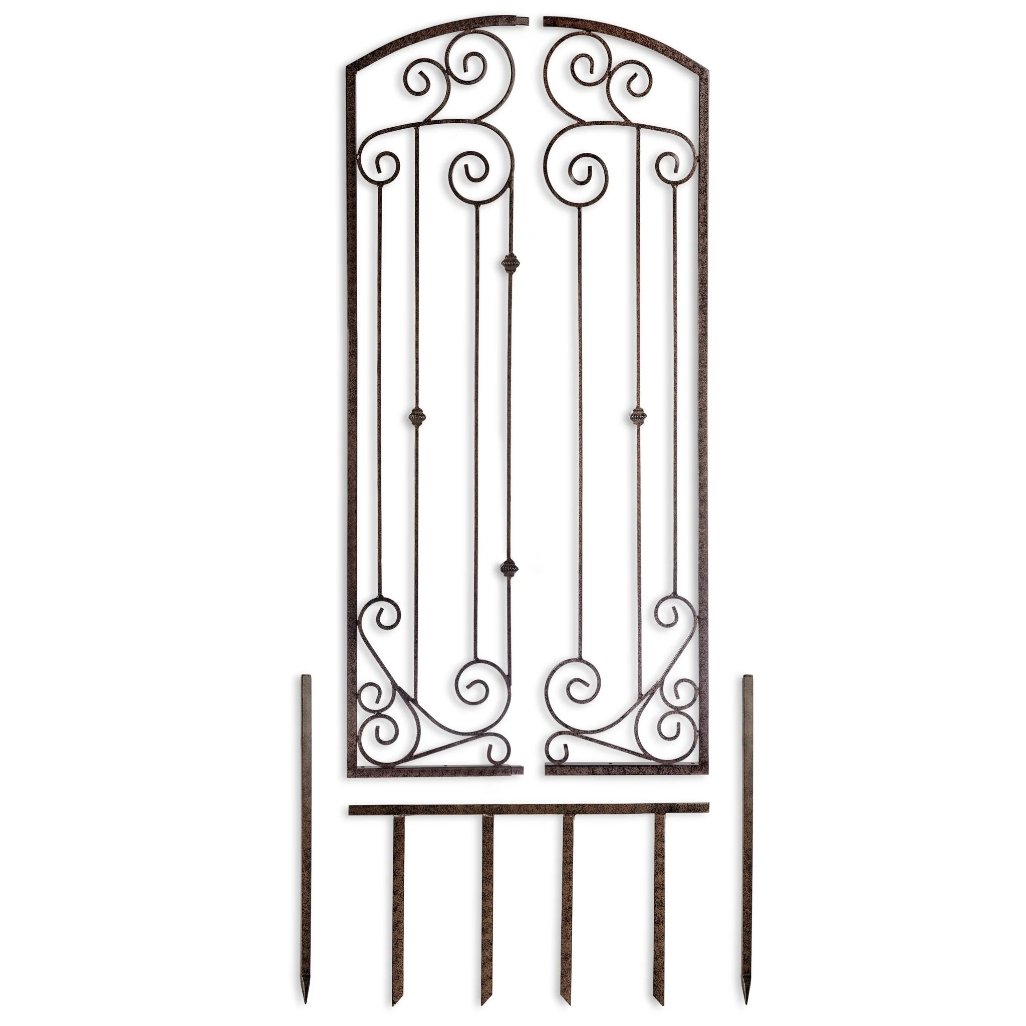 - Heavy iron construction supports vigorous climbing plants and mature vines.