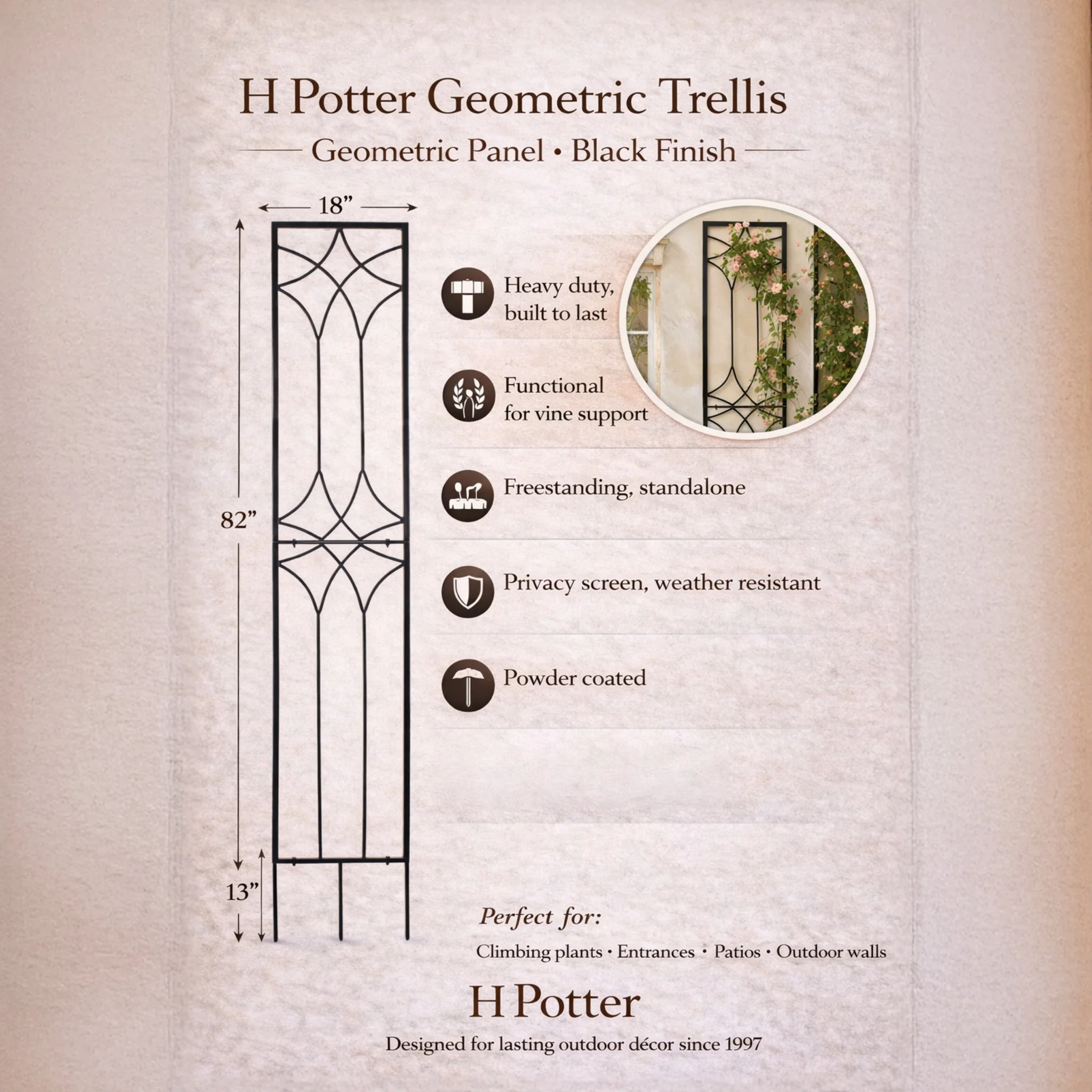 H Potter metal trellises are created using heavy duty iron for ultimate durability. This trellis is powder-coated a flat black and finished with a high grade clear-coat protective sealer. This smooth finish can be spray painted once you receive your trellis if you prefer a different color.