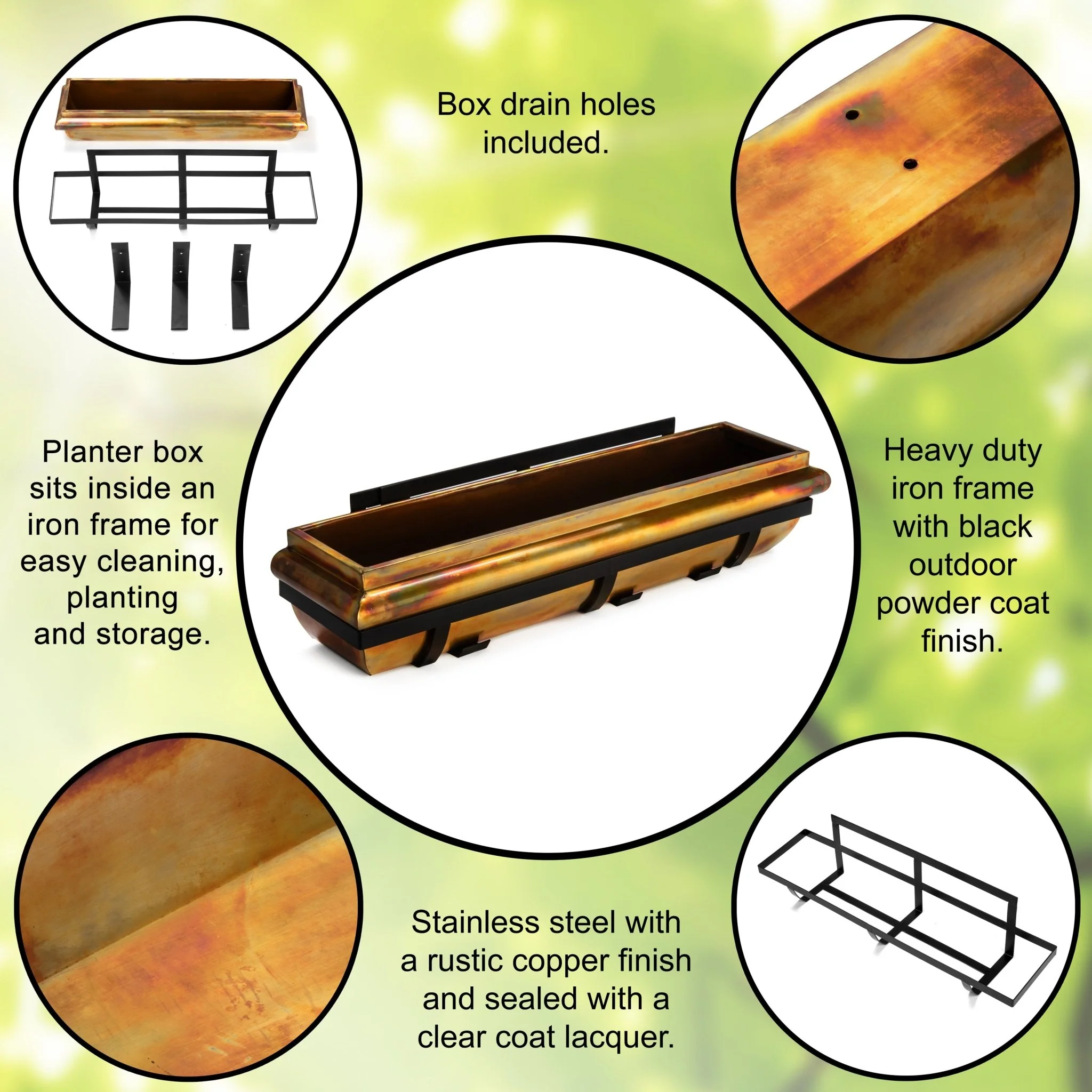 - Planting box: Stainless steel with rustic copper finish
