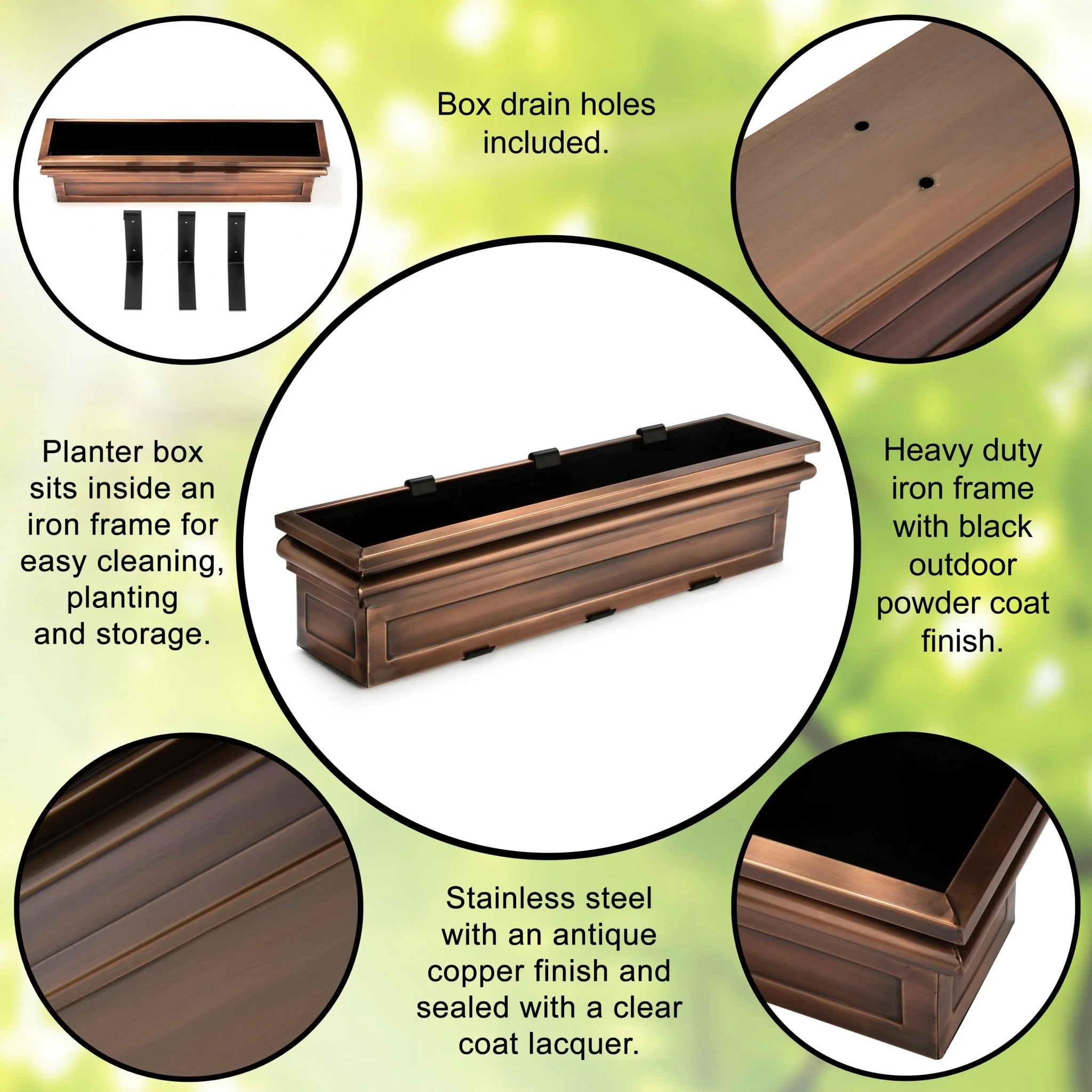 Materials: The Williamsburg window box includes a stainless steel planting box with an antique copper finish and thick iron mounting brackets with a black powder-coated protective finish.
